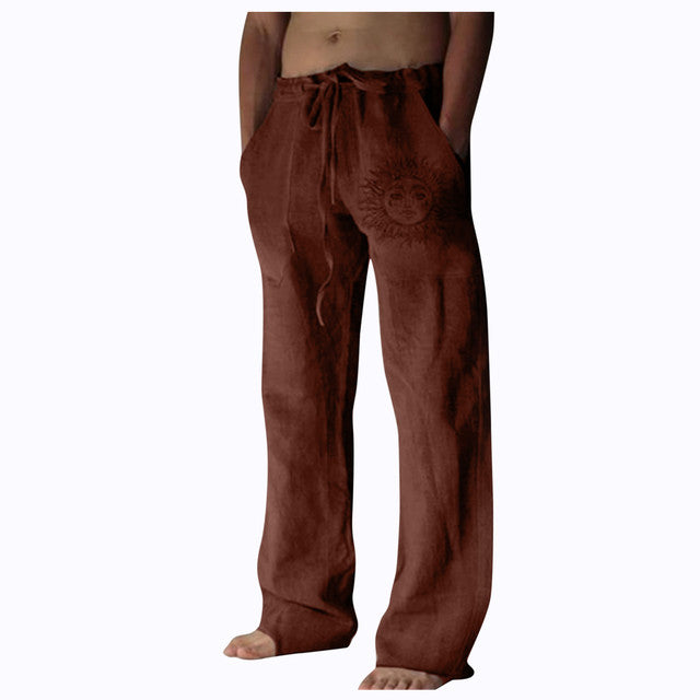 The history of the sun print design on these pants are from helios, the Greek sun god of the sky.